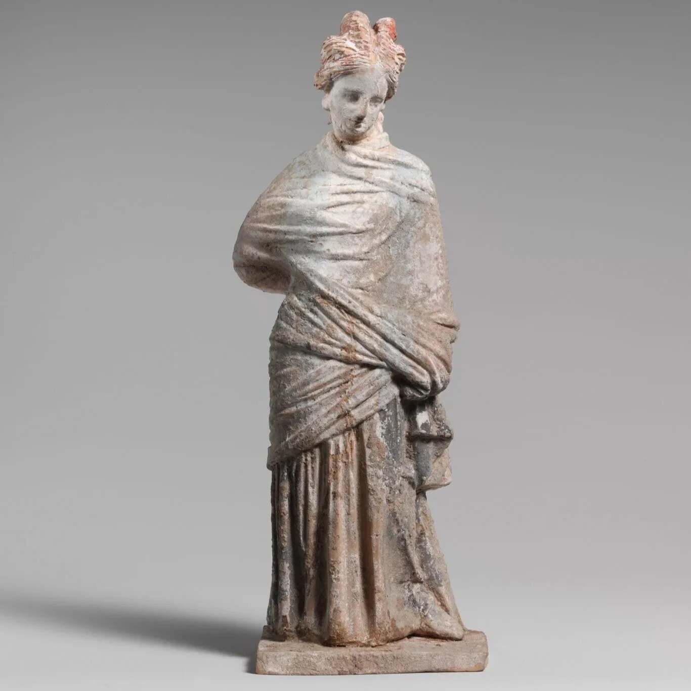 Tanagra figurines are small terracotta figures dating primarily from 300 to 50 B.C. “Tanagras” are a specific style of Hellenistic figurines originally crafted in Athens, but later produced in Tanagra. They are well-dressed, with a majority wrapped in thin himations (cloaks), and sometimes wearing broad-brimmed hats and holding mirrors, wreaths or fans. They were made in a variety of poses, both sitting and standing. Overall, they reflect a sense of charm and fashion.